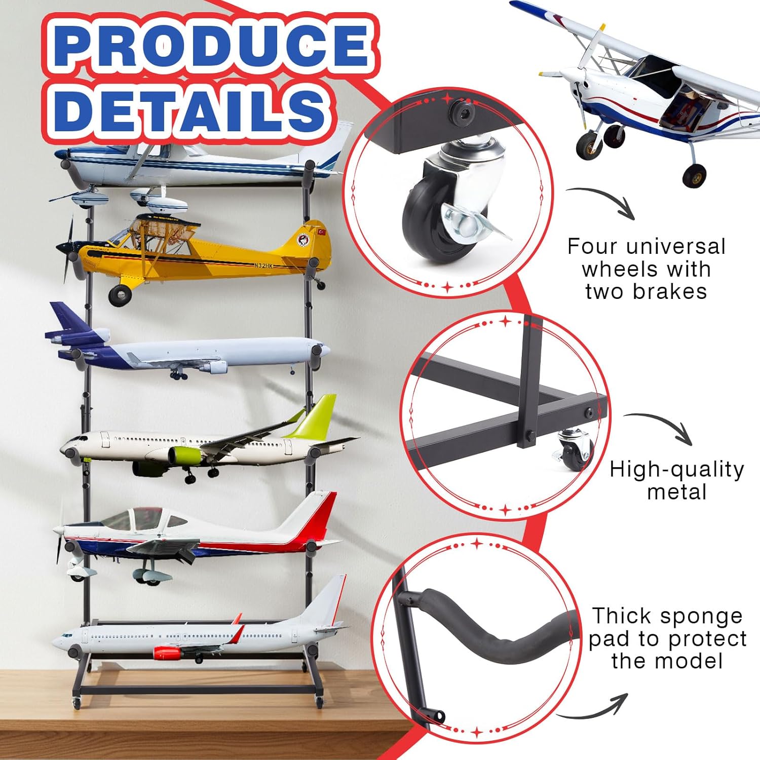 Features: Elevate your RC airplane storage with our sleek airplane display stand! Constructed from durable black steel, this RC airplanes storage rack measures 71 x 34 x 32 inches, offering a robust and reliable solution for all your model storage needs. Its 6 adjustable storage rack layers are equipped with thick foam pads, expertly protecting your models from scratches while allowing for customizable height adjustments. The rack's practical design maximizes space with effortless organization. Plus, the stand features 4 universal wheels, including 2 rear brakes, for easy mobility and secure parking. Specifications: Material: steel Color: black Size: about 71 x 34 x 32 inches/ 180 x 85 x 80.5 cm Package includes: 1 x Wheeled RC airplanes storage rack Notes: Manual measurement, please allow slight errors on size. The color may exist a slight difference due to different screen displays