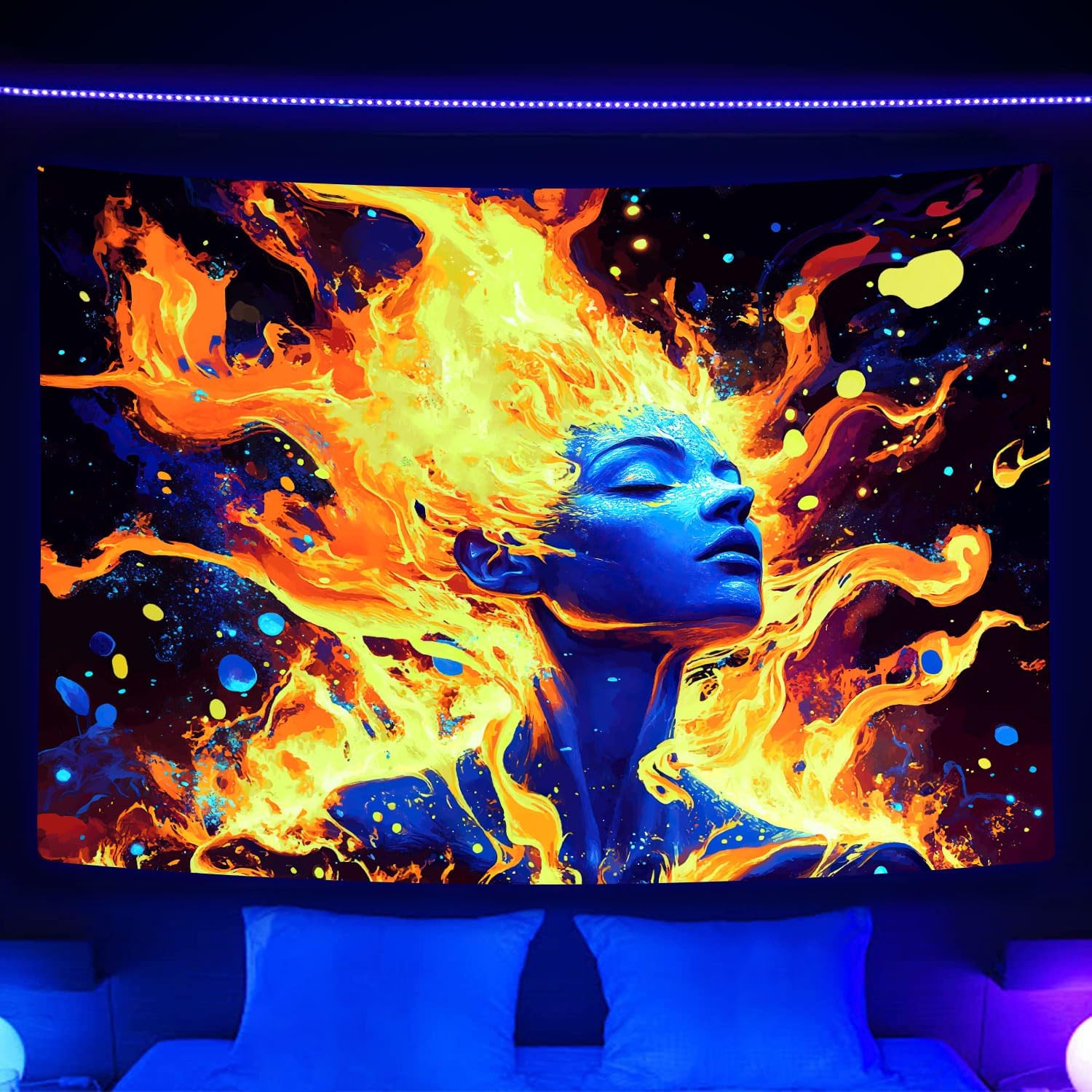 UV/Black light Reactive: The utilization of special ink and an advanced printing process results in a mesmerizing glow under ultraviolet light, showcasing the enigmatic allure and vastness through black light technology. As night descends, switch on the UV/black light to experience a psychedelic and vibrant bedroom art piece. During our exploration of different black light wall hangings, we encountered an issue where some tapestries appeared less than perfect when viewed under normal lighting conditions. However, our dedicated team persevered in their research and experimentation efforts, ultimately achieving flawless display quality for our tapestries even in regular lighting. Whether it is illuminated by natural or black light sources, they fully embody the distinctive visual effects that captivate the senses.Please note that the actual visual impact is contingent upon the intensity of the lamp employed; our captivating pictures and videos were captured under a 40w 365nm UV lamp.