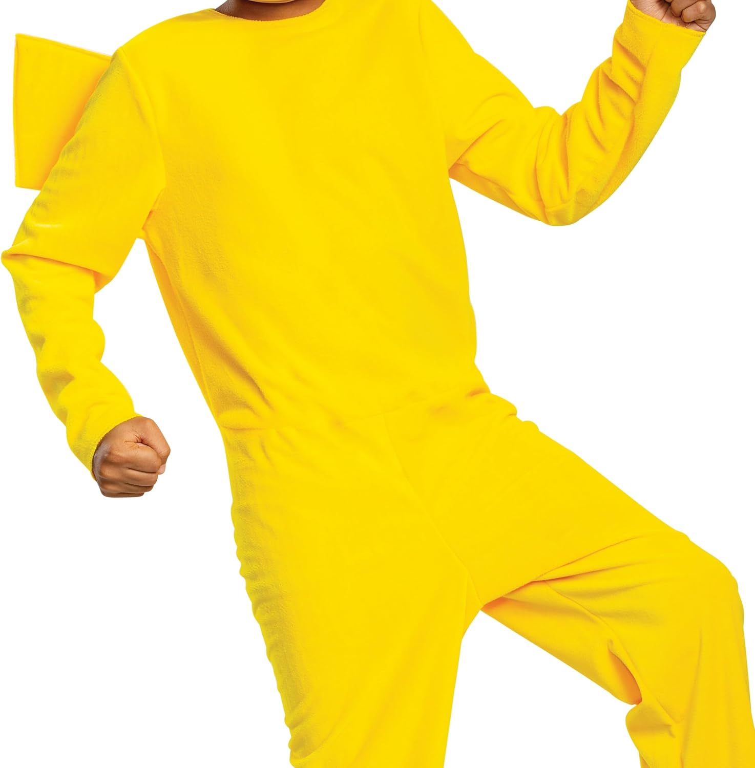 Become the beloved electric-type Pokemon, Pikachu, with this Classic Child Costume. This costume features a yellow jumpsuit with a connected lightning bolt tail and a character half mask, allowing you to channel your inner Pikachu and strike fear into opponents.