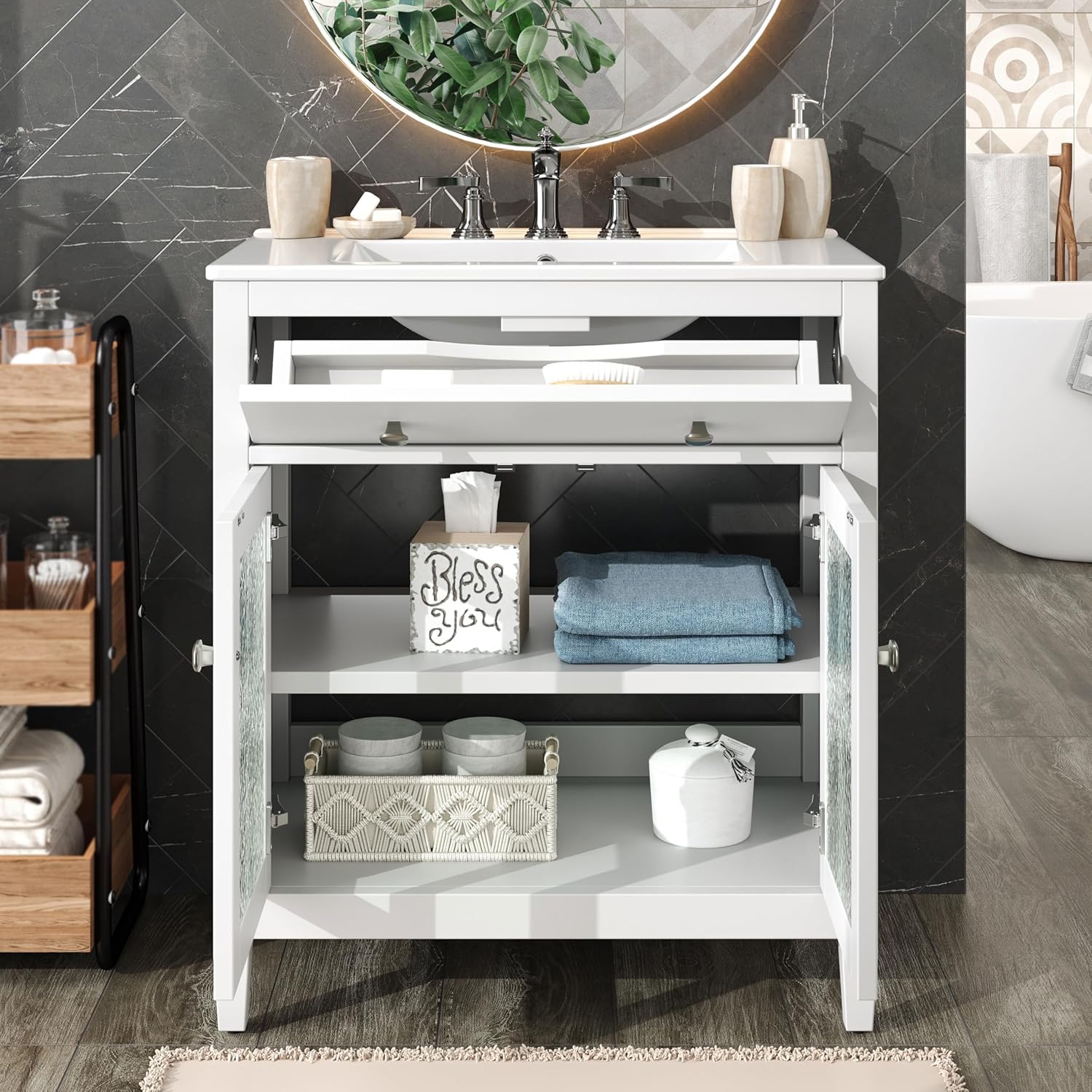 Basic InformationColour:WhiteMaterial:Ceramic, Solid Wood + MDFFilling:Solid Wood + MDFSuitable for:BathroomMounting Type:Free-StandingNumber of Shelves:1Compatible Faucet Installation Type:8" WidespreadWeight Capacity:120 lbsFaucet Included:NoProduct DimensionsAssembled Length (inches):30.00Assembled Width (inches):18.43Assembled Height (inches):34.05Product Weight (lbs):83.77Base Weight (lbs):52.91Countertop Weight (lbs):30.86Door Height - Top to Bottom (in.):19.29Door Width - Side to Side (in.):13Faucet Centres (in.):1.47Packaging DimensionsLength (inches):36.70Width (inches):22.70Height (inches):18.10Weight (lbs.):95.24