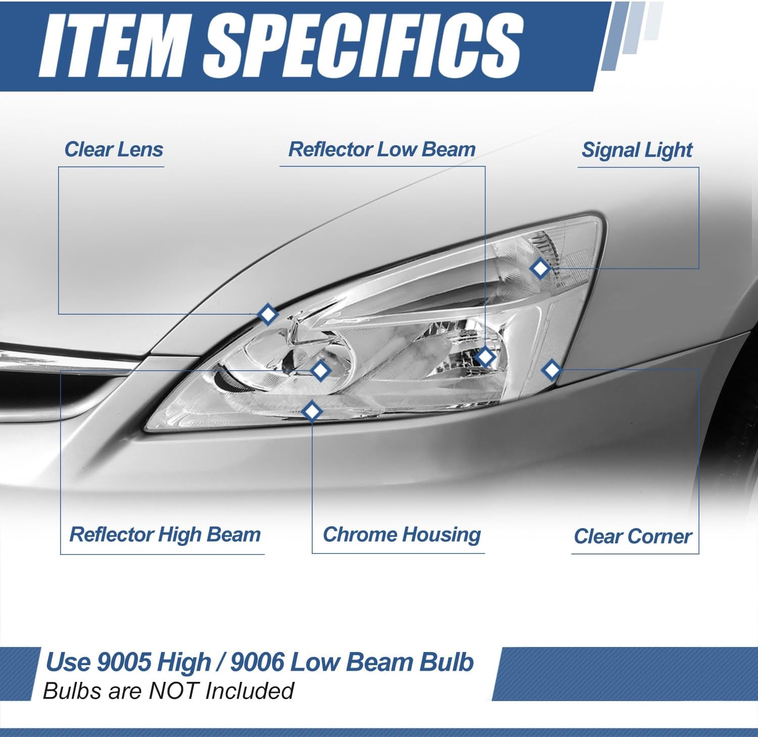 • Product Specification - Bulb Type: Halogen | Beam Type: Reflector | Bulb Model: 9005 High / 9006 Low Beam (Not Included) | Signal Light: 1157A (Included) | Housing Color: Chrome | Lens Color: Clear | OEM Part Number: 33151SDAA01 33101SDAA01 | Parkslink Number: HO2502120 HO2503120