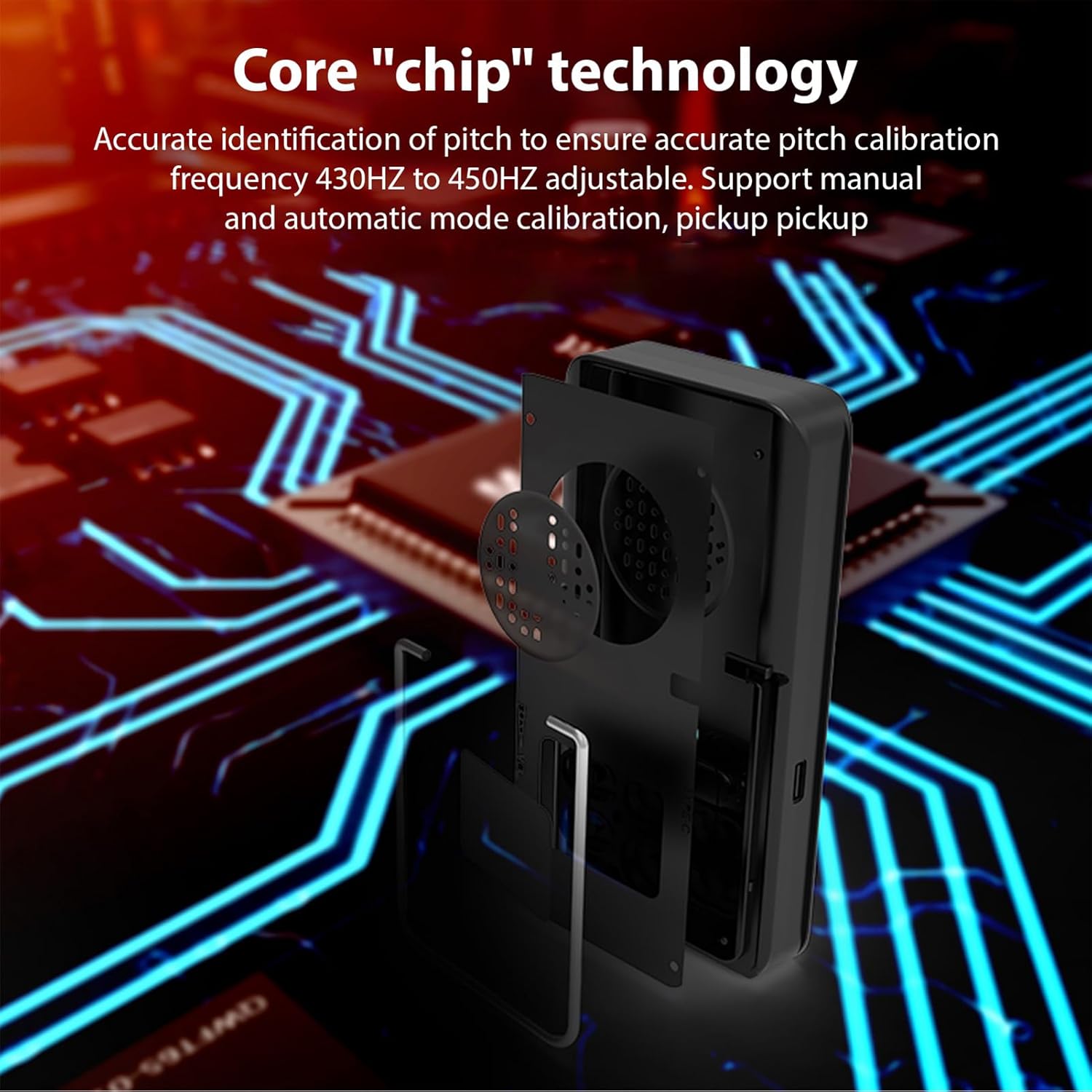 [PRECISION TUNING] Our advanced digital tuner features cutting-edge core chip technology that delivers unparalleled pitch accuracy. With an adjustable tuning range of 430Hz to 450Hz, this tuner offers both manual and automatic modes for flexible operation. The intuitive pickup system ensures effortless setup, making it ideal for musicians of all levels who demand professional-grade tuning precision.[REAL-TIME VISUAL FEEDBACK] Experience immediate performance feedback with our innovative five-line staff display that shows both the musical note and exact pitch deviation. This dynamic visual interface allows you to instant corrections while playing, significantly enhancing your practice sessions and helping you develop pitch accuracy faster than ever before.[VERSATILE NOTE CONTROL] Seamlessly switch between high and low notes with our intelligent tone tracking system. The tuner continuously analyzes your sound input, displaying real-time pitch comparisons against tones. This powerful feature enables precise key selection and detailed deviation analysis, for mastering complex musical pieces across various octaves.[ADVANCED NOISE REDUCTION] Our specially engineered sound isolation technology effectively filters out environmental noise and interference. This sophisticated system maintains signal clarity even in busy practice environments, ensuring your tuning sessions remain accurate and undisturbed by external audio distractions.[UNIVERSAL COMPATIBILITY] Designed for professional musicians, this tuner supports twelve-tone equal temperament and works flawlessly with strings, wind instruments, and vocals. Featuring standard sound mode with adjustable volume and automatic pitch detection, it instantly emits corresponding reference tones for real-time pitch comparison across all your instruments.Spec:Features:【Precision Tuning】: Our tuner is equipped with a core chip technology that accurately identifies pitch, ensuring